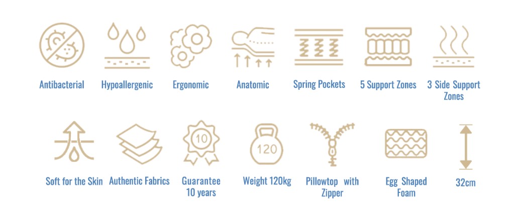 θερμότητα του σώματος, παρέχοντας την απόλυτη αίσθηση δροσιάς. Η ιδιαίτερη πυκνότητα του υφάσματος καθιστά το στρώμα μια πολυτελή λύση στον ύπνο. Οι 5 ζώνες στήριξης μέσης, οι 3 ζώνες περιμετρικής στήριξης, τα ανεξάρτητα ελατήρια και το αποσπώμενο ανώστρωμα ολοκληρώνουν το μοναδικό στρώμα.