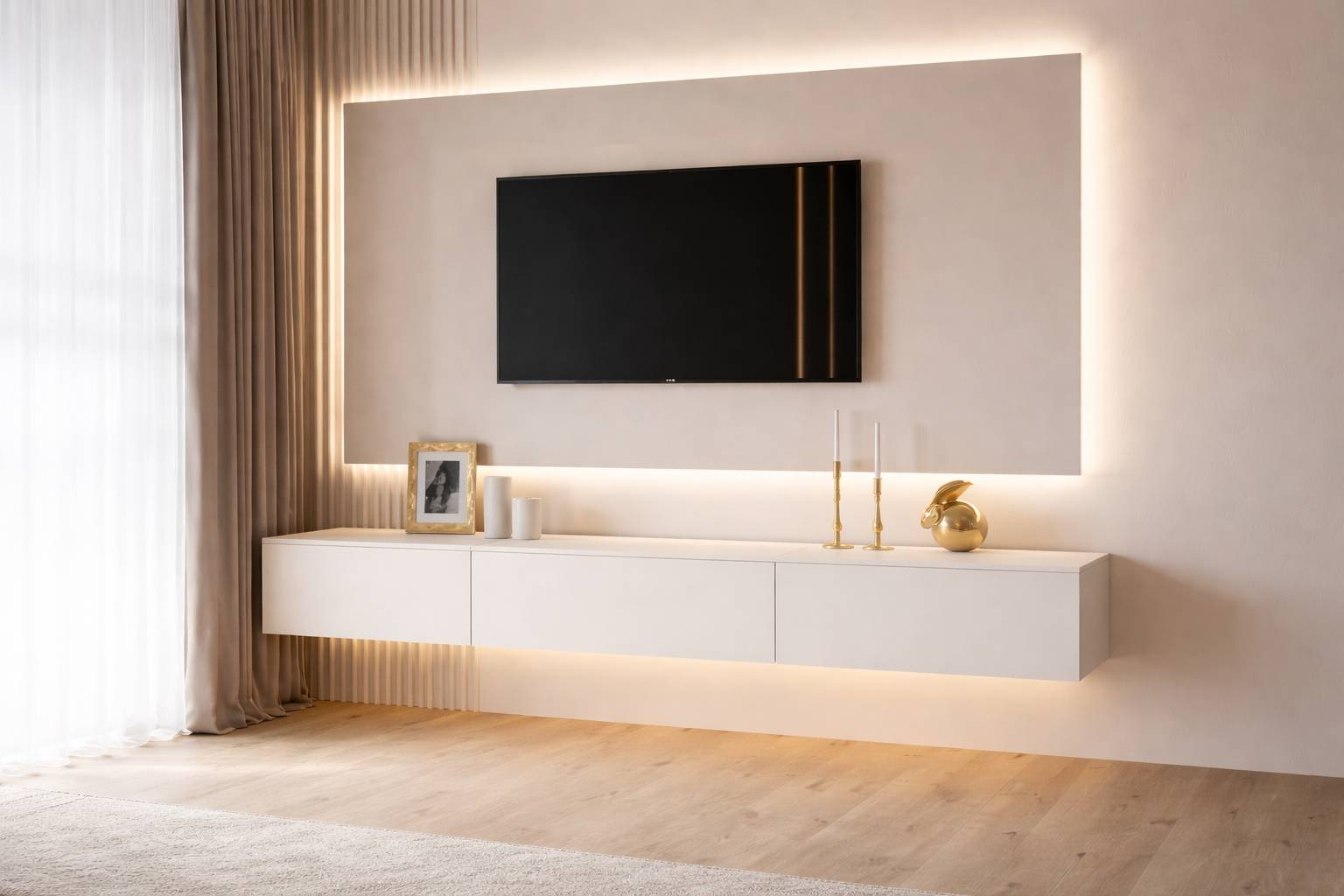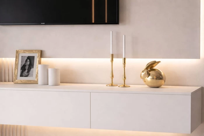 Η ενσωματωμένη LED φωτιστική λεπτομέρεια προσθέτει μια ζεστή και ατμοσφαιρική πινελιά, αναδεικνύοντας το έπιπλο και δημιουργώντας ένα σύγχρονο, elegant αποτέλεσμα. Η ουδέτερη απόχρωση το καθιστά ιδανικό για κάθε διακόσμηση, από μοντέρνα έως minimal.