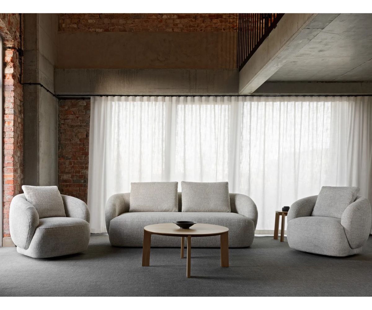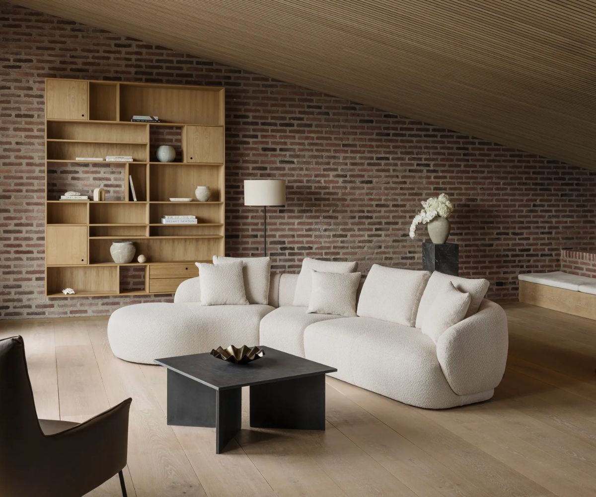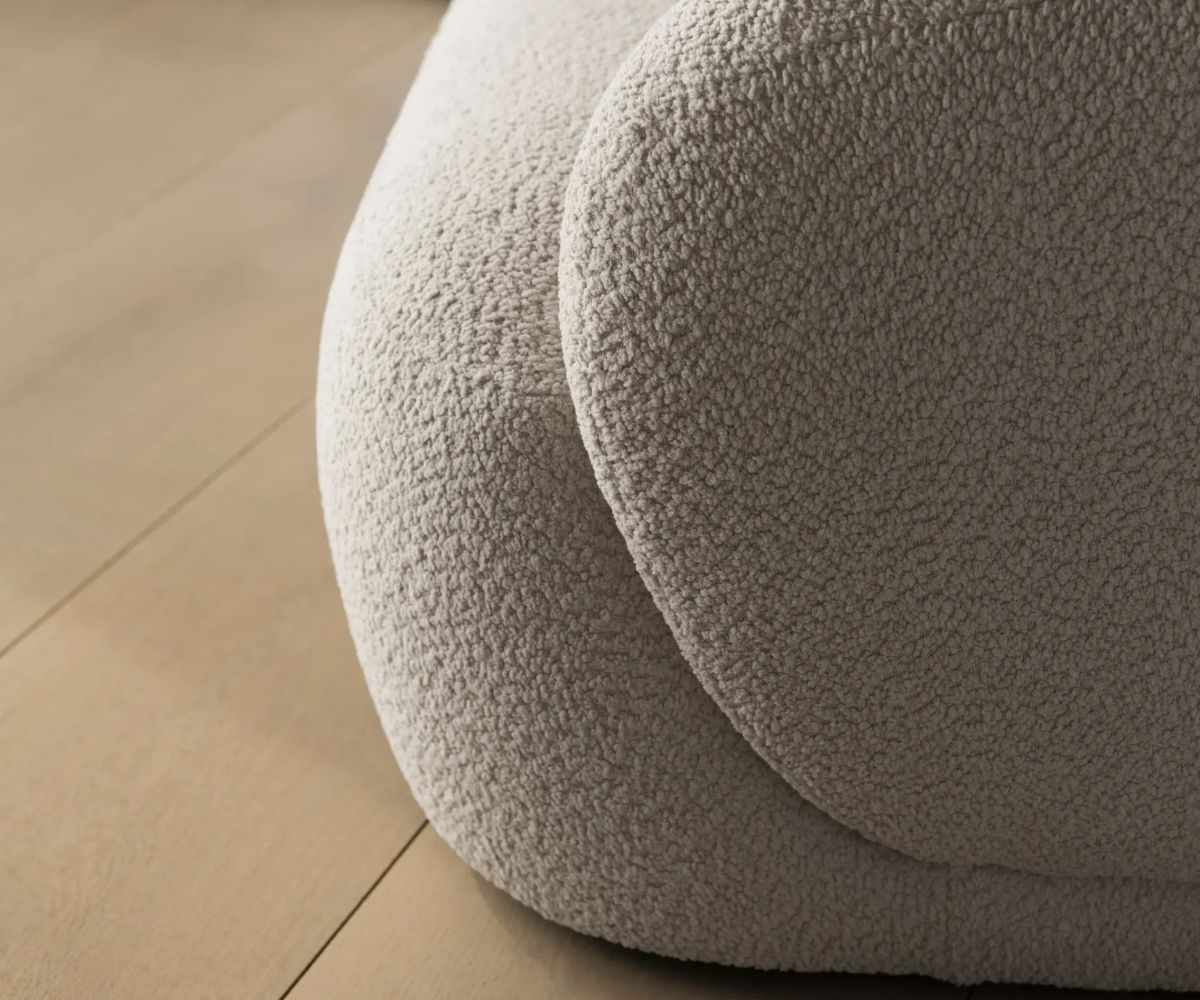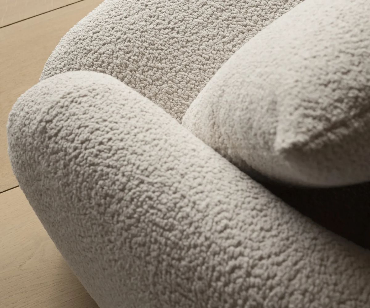 Η απαλή, bouclé υφή του υφάσματος σε ουδέτερο τόνο δημιουργεί μια ζεστή και φιλόξενη ατμόσφαιρα, ενώ η χαμηλή και φαρδιά κατασκευή του προσφέρει μοναδική χαλάρωση. Ο γωνιακός σχεδιασμός του προσαρμόζεται άψογα σε μεγάλους ή open-plan χώρους, αναδεικνύοντας τη γεωμετρία του σαλονιού.