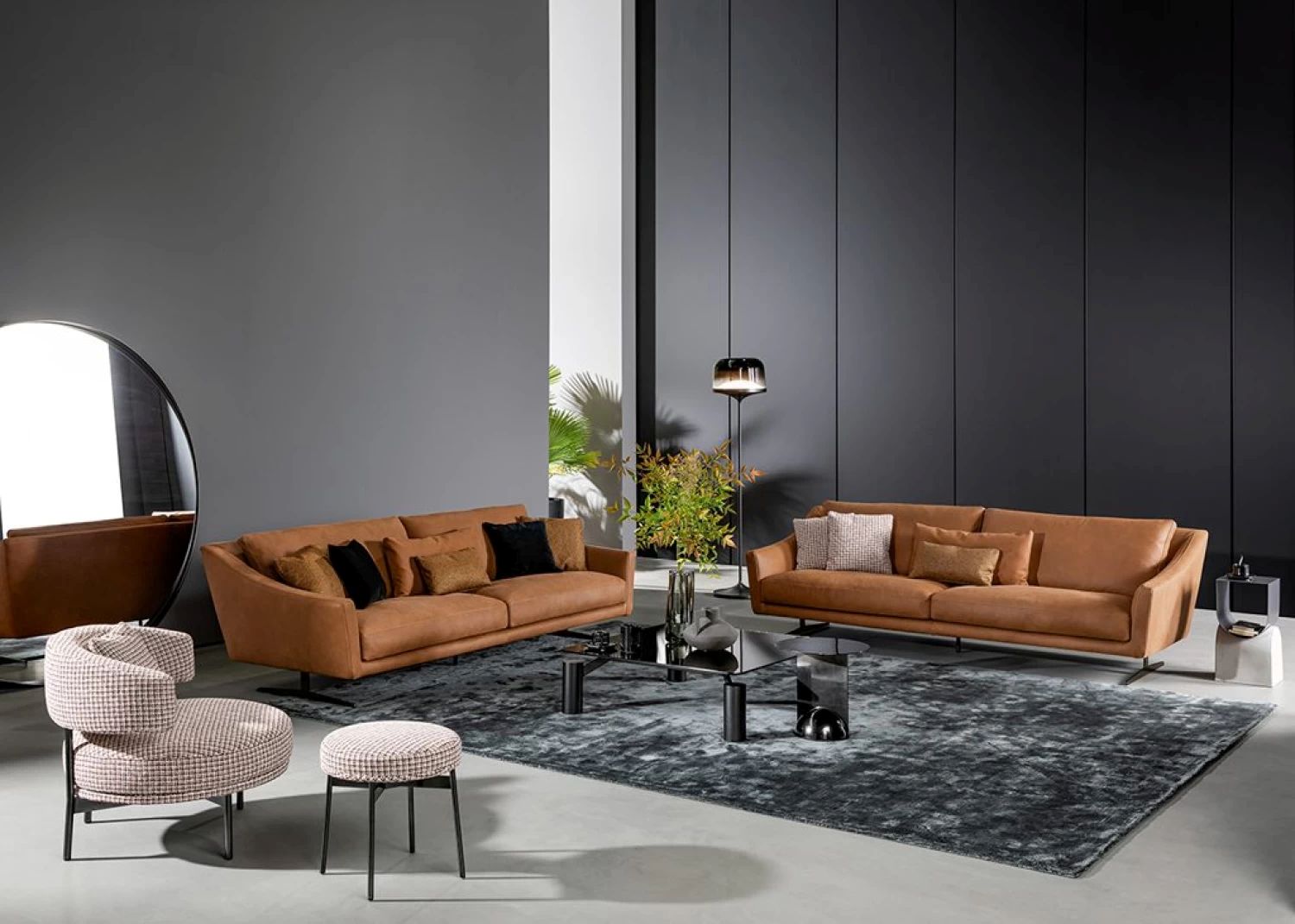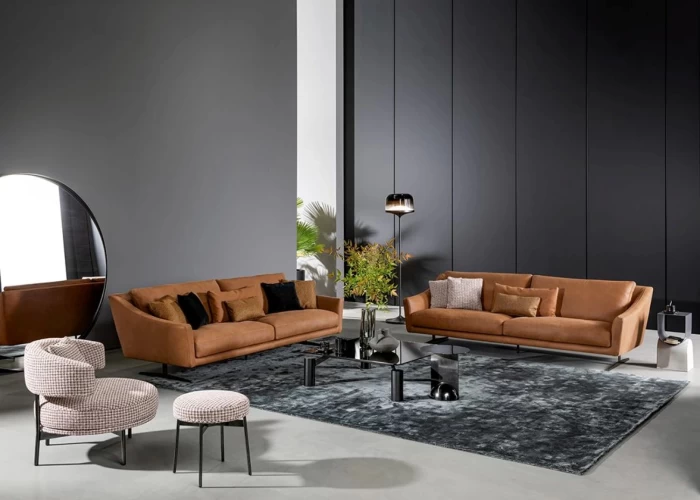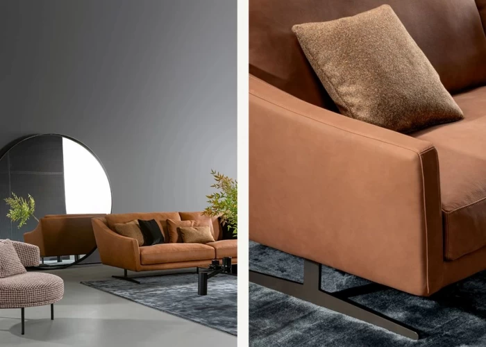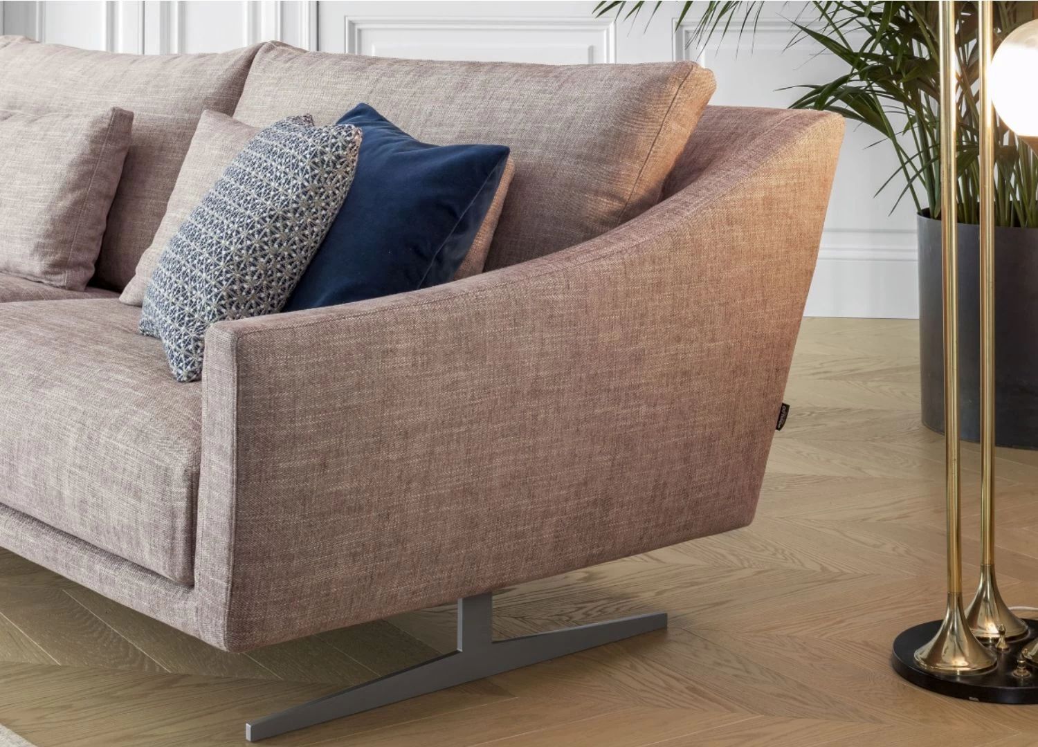 Η υψηλής ποιότητας επένδυση προσφέρει ευχάριστη υφή και αντοχή στη χρήση, ενώ τα άνετα μαξιλάρια εξασφαλίζουν χαλάρωση σε κάθε στιγμή της ημέρας. Τα λεπτά μεταλλικά πόδια προσδίδουν μία μοντέρνα πινελιά, δημιουργώντας μια αίσθηση ελαφρότητας και πολυτέλειας.