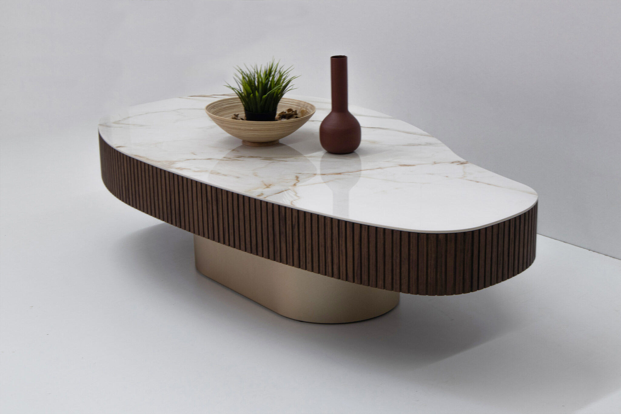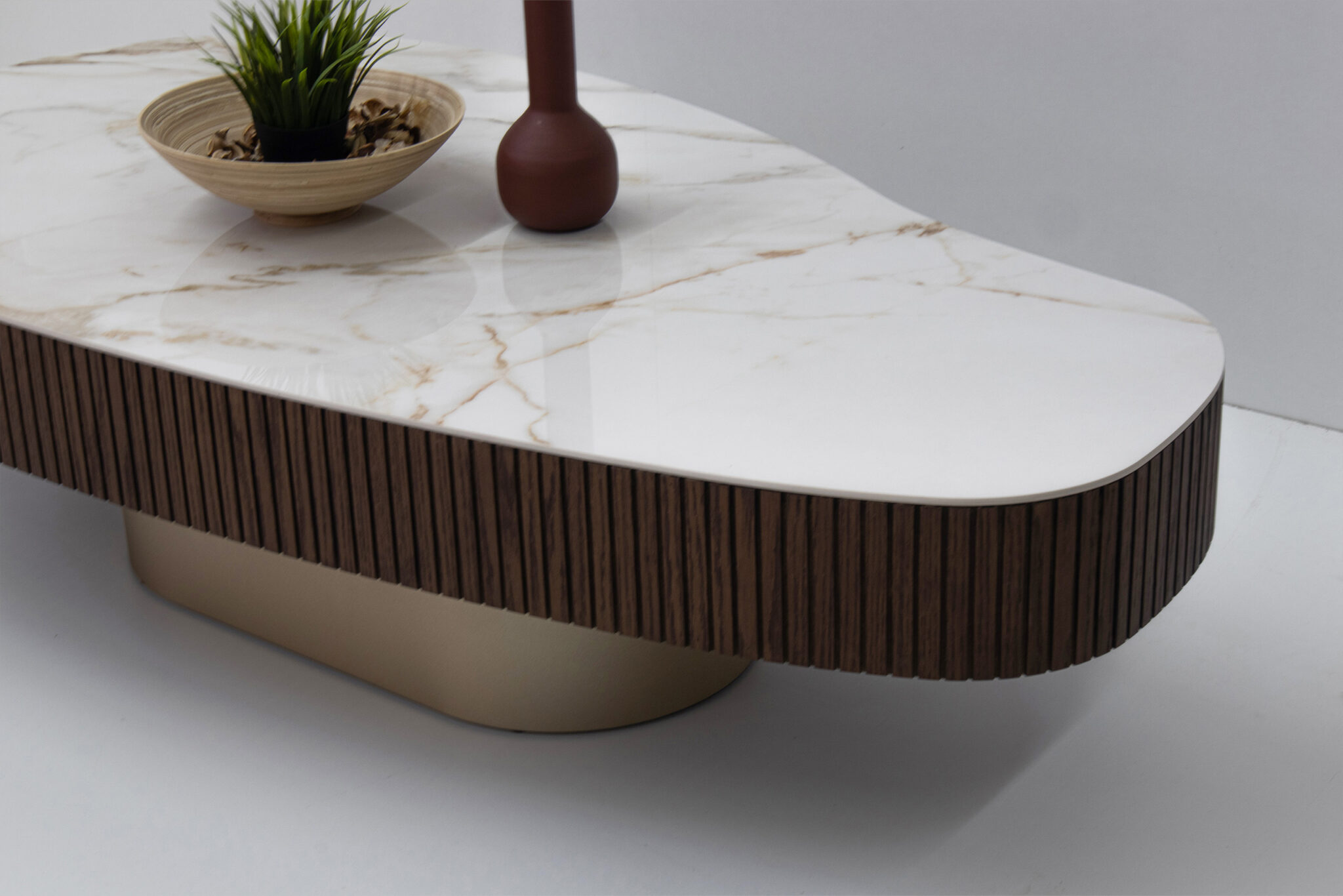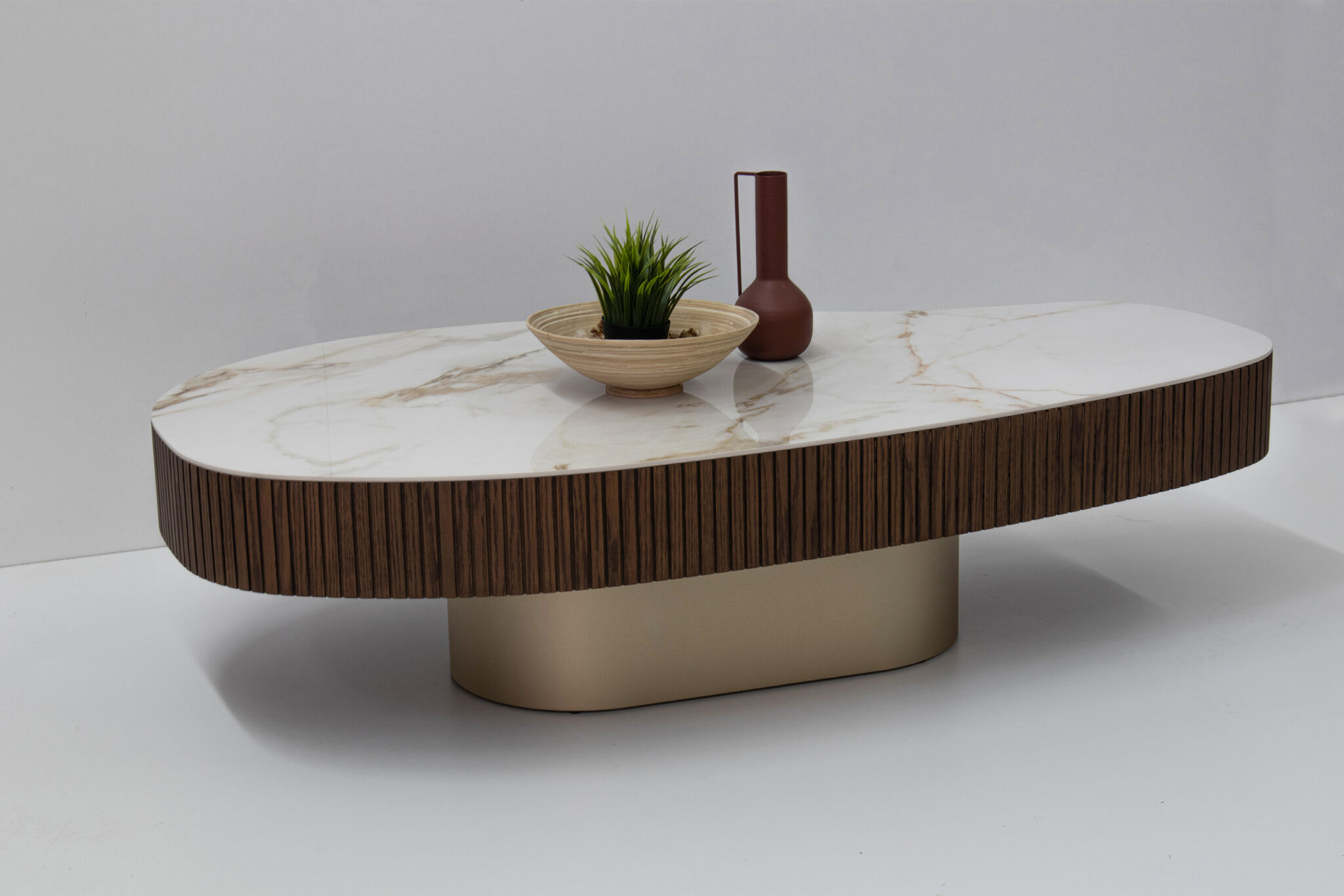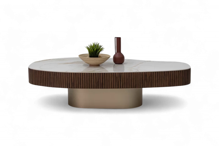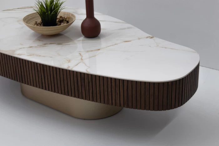 Κομψό τραπεζάκι σαλονιού με σύγχρονη αισθητική που αναβαθμίζει κάθε χώρο. Η επιφάνεια σε λευκή απόχρωση με όψη μαρμάρου προσδίδει πολυτέλεια και φωτεινότητα, ενώ η περιμετρική επένδυση με κάθετες ξύλινες ραβδώσεις σε σκούρο τόνο δημιουργεί μια ιδιαίτερη και ζεστή αντίθεση.